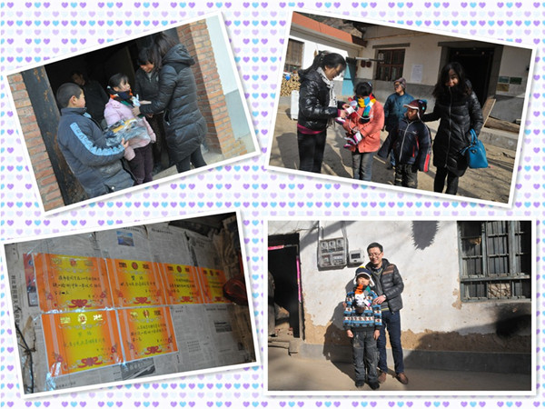 一路崎嶇,來到了草坪村。青山環(huán)繞,空氣清晰,這里沒有城市的霧霾和喧囂,寧靜而美麗。在劉村長(zhǎng)的帶領(lǐng)下一行人浩浩蕩蕩來到四個(gè)貧困家庭,為他們送上帽子、圍巾、手套、書包和一些過冬保暖的衣物。當(dāng)給孩子們帶上帽子圍巾手套時(shí),孩子們嘴角揚(yáng)起了微笑。其中一個(gè)小朋友說:“好喜歡著個(gè)書包,期末考試我一定考第一名”,在場(chǎng)的人都為他加油鼓掌。