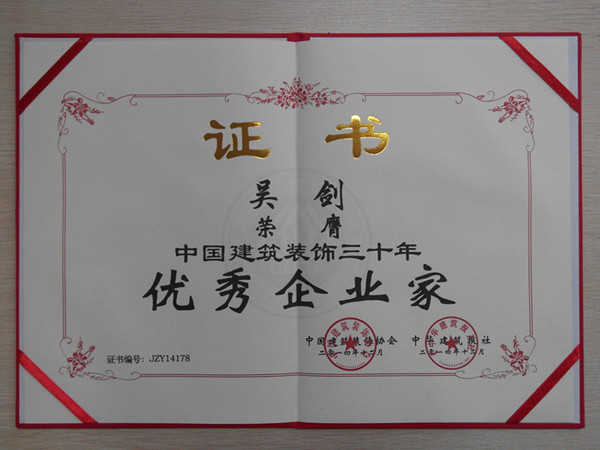 2014年是中國建筑裝飾行業(yè)誕生的三十年。這三十年來,隨著國民經(jīng)濟(jì)的蓬勃發(fā)展,我國建筑裝飾行業(yè)呈現(xiàn)出持續(xù)發(fā)展的良好趨勢,涌現(xiàn)出一批開創(chuàng)行業(yè)先河或在專業(yè)化市場獨(dú)占鰲頭的領(lǐng)軍企業(yè),以及一批為行業(yè)發(fā)展做出突出貢獻(xiàn)的功勛人物。他們憑借著嚴(yán)格的質(zhì)量把控、規(guī)范的施工管理和持續(xù)的技術(shù)創(chuàng)新,用勤勞和智慧鑄就了一座座精品建筑,為經(jīng)濟(jì)發(fā)展、美化環(huán)境和提高人居質(zhì)量做出了重要貢獻(xiàn)。而我公司的吳劍董事長就是這些突出貢獻(xiàn)人員中的一員。