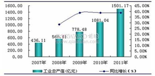 近年來,中國建筑幕墻行業(yè)持續(xù)快速增長。數(shù)據(jù)顯示,2011 年,中國建筑幕墻行業(yè)規(guī)模以上企業(yè)有452 家,比2010 年增加了85 家;銷售收入1101.85 萬元,同比增長32.71%;利潤總額為176 億元,同比增長76.82%。;資產(chǎn)總計1209.34 億元,同比增長35.20%;建筑幕墻總產(chǎn)量達(dá)到8300 萬平方米,較2001 年增長了4.19 倍。行業(yè)經(jīng)濟效益良好。