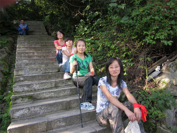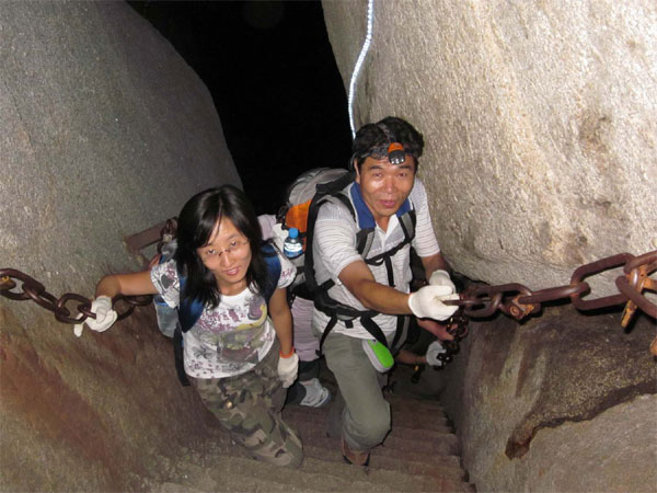夜晚的月光分外皎潔,空氣異常清新,時(shí)時(shí)還伴著陣陣的水流聲,從沒有在夜間享受過如此心境的我們感覺里真是到了人間仙境呀!走在最前邊的同事信心百倍,一路領(lǐng)先。不時(shí)停下來等待后面的同事趕上,看到趕上來的同事,一起說著鼓勵(lì)的話,讓人感到無盡的關(guān)懷和振奮,往日的煩惱也在此刻一掃而光。當(dāng)征服了華山險(xiǎn)境“千尺幢”和“老君犁溝”的時(shí)候,我們每個(gè)人都已汗流浹背,氣喘吁吁了。累了,找個(gè)較為平坦的地方暫坐休息;渴了、餓了,拿出隨身背的水和食物吃上一兩口,又繼續(xù)趕路。一路上,我們總是有說有笑,互相幫助,彼此鼓勵(lì),真是其樂無窮呀!