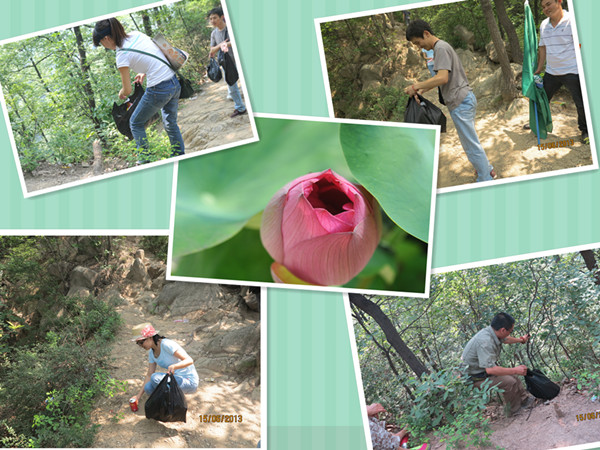 在吳總監(jiān)的帶領(lǐng)下,我們每個人手提垃圾袋沿著山路往上。一路上,風(fēng)景如畫,空氣清晰,美麗的大自然風(fēng)光不住地映入我們的眼簾,可再仔細(xì)環(huán)顧周圍,卻發(fā)現(xiàn)路兩旁不時有游客登山游玩時隨意丟棄的食品包裝袋和煙頭等垃圾。大家相互配合,認(rèn)真、仔細(xì)地清理垃圾。雖然有些垃圾比較難清理,但大家沒有皺眉頭,而是想盡各種辦法清理。我們在清理過程中,不光自己清理,還很有禮貌地提醒過往的游客們將垃圾扔入垃圾箱。活動中,有幾個游客好奇地問我們:“你們是志愿者么?”,“不是”;“你們是自發(fā)來的嗎?”,“不是,是我們公司組織的”;“你們是哪個公司的?”,“西安天幕公司”;“你們公司的文化氣息讓人敬佩的……”,“謝謝!”等等,聽到部分游客贊許的話語,我們感覺到這次活動的意義所在,不僅自己能與大自然親近,還能感染身邊的游客不要亂扔垃圾。用社會上比較流行的一個詞表達(dá),那就是傳遞了“正能量”!