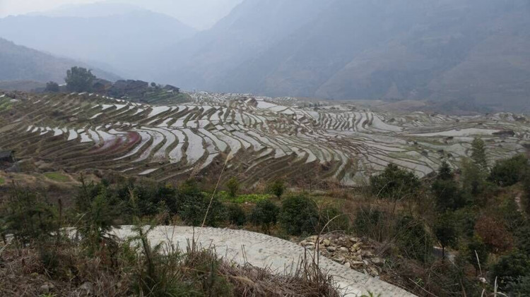 2015年2月6日我們一行8人乘車去游覽“龍脊梯田”。可能是去的季節(jié)不合適吧,景色很一般,但梯田的氣勢(shì)卻令我們?yōu)橹@嘆;從山腳盤繞道山頂,,小山如螺,大山似塔,層層疊疊,高低錯(cuò)落,從高處望去梯田的優(yōu)美線條,或平或交叉,蜿蜒如春螺,披嵐似云塔,顯示了動(dòng)人心魂曲線美,其線條行云流水,規(guī)模磅礴壯觀,宏偉,值得我們贊嘆!藏族同胞辛勤勞作的美德給我留下深深的印象。下午我們游覽了“義江緣”。義江緣是桂西北少數(shù)民族風(fēng)情景區(qū),觀看了農(nóng)家風(fēng)貌,農(nóng)耕文化和田園風(fēng)光,也領(lǐng)略理桂林八景之首的義江風(fēng)光。