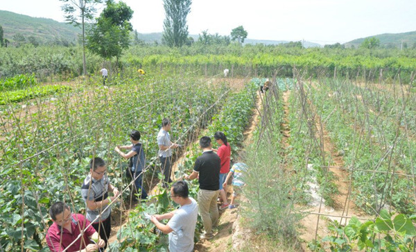 這是一個(gè)收獲的季節(jié),車窗外的田地里到處都是金黃色的麥子,也隨處可見忙碌的收割機(jī)和收麥子的人。經(jīng)過一段時(shí)間的車程,我們到達(dá)了最終目的地。小小的菜園子,里面的蔬菜種類還真不少,有已經(jīng)成熟的西葫蘆,有綠茵茵的韭菜,有在枝頭待摘的大黃瓜,也有長(zhǎng)勢(shì)茂盛的大蔥,還有正在沐浴陽光,茁壯成長(zhǎng)的西紅柿。大家各自分工,有的拔草,有的鋤地,有的綁瓜蔓,也不時(shí)不時(shí)的摘上幾個(gè)黃瓜嘗鮮,當(dāng)然也不能少了拍照留念。在大家的努力下,這項(xiàng)工作算是告一段落了。之后我們受到了吳總家人的熱情款待,吃了香甜可口的西瓜,然后帶上由吳經(jīng)理親手撈的魚,去農(nóng)家樂享受我們豐盛的午餐。之后又坐船領(lǐng)略了水庫周圍的秀麗景色,然后進(jìn)行最后一項(xiàng)活動(dòng)--摘菜。