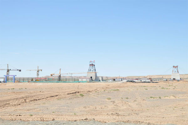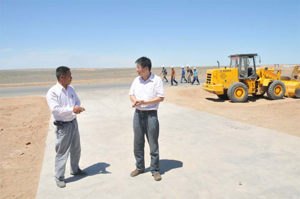 在工地上的幾天里,吳總和大家一起深入工程第一線。施工現(xiàn)場,這是在千里無人的戈壁灘上,到處是戈壁荒灘,平時風(fēng)很大,一般都有四到五級,風(fēng)沙吹起的石頭打的人特別的疼。大部分時間都是在這樣的環(huán)境下開工的,最熱的時候沒有太多的水,即使戴上防風(fēng)鏡,可臉上和身上已經(jīng)掛滿了泥土。