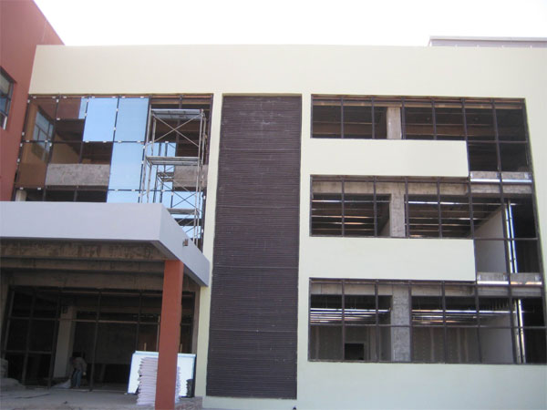 該項工程在公司領(lǐng)導(dǎo)的重視下,施工進展順利,截至目前,前期工序基本完成。預(yù)計本周末所有幕墻玻璃、雨篷玻璃將安裝完成。百葉窗所有百葉也將安裝完成。
